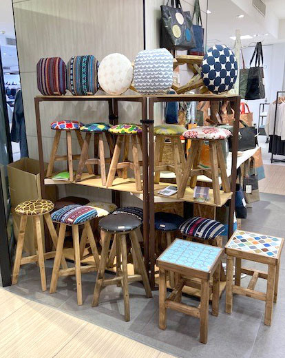 サイドテーブルにもなるタイル張りスツールの実物を店頭で販売しております。