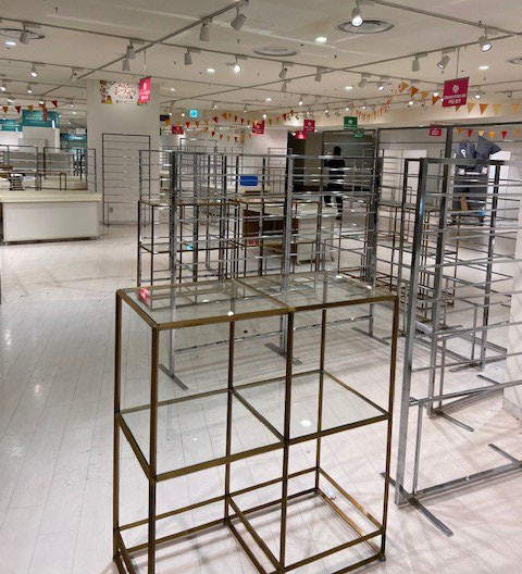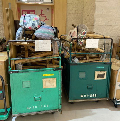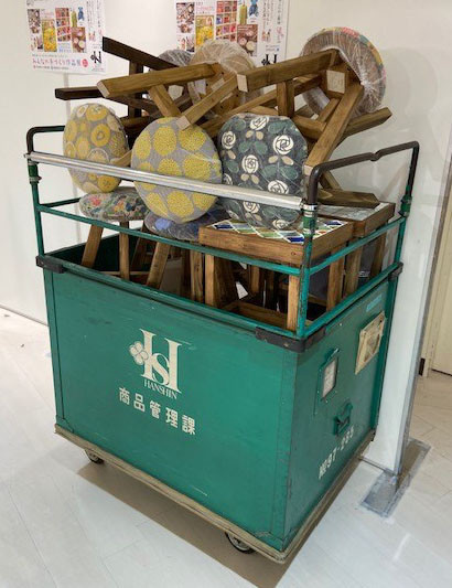 かご車(阪神百貨店ではボテと呼ばれてます)に3台 54脚を地下3階から8階まで上げてきましたが会場が設営中のため設置は明日の朝になります。