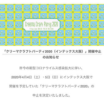 クリーマクラフトパーティー2020(南港インテックス)中止になりました。 2020/03/03 クリーマクラフトパーティー2020(南港インテックス) 中止になりました。 クリーマクラフトパーティー2020(南港インテックス) 中止になりました。 こんばんは、tukuru woodwork fujimotoです。 6日間催事で店頭に立っていたので1週間ぶりの工房での仕事です。 朝一掃除、ゴミ出しの後コーヒーを入れて一服しているところに衝撃のメールが来ました。 てづバに続いてクリーマクラフトパーティー2020(南港インテックス)も中止になりました。 4月4日5日開催予定だったのですが早い決断です・・・ このままイベントの中止が続くと死活問題です・・ お問い合わせ