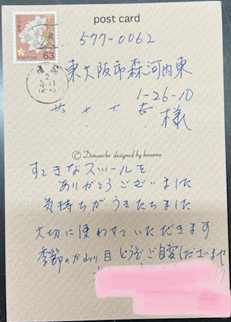 サイドテーブルにもなるタイル張りスツールジャスミンワイドをお送りしたお客さまから絵手紙の御礼状を頂きました。