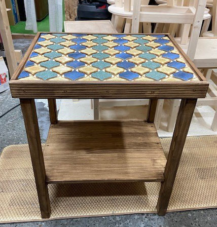 で作成途中のフルサイズオーダーのタイル張りテーブルの仕上げに掛かりました。