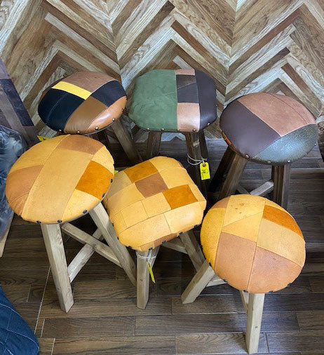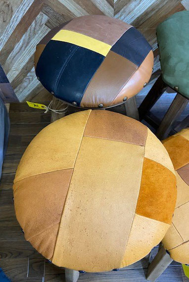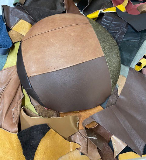 一枚革の端っこ部分や座面には小さいもの、座面を張った後に余分な部分をカットする際に出る端材は捨てないで置いてあります。