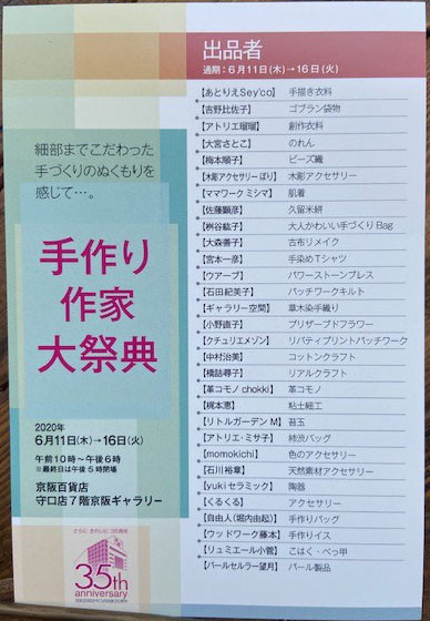 京阪百貨店守口店催事 2020/06/02 京阪百貨店守口店催事 手作り作家大祭典 京阪百貨店守口店催事 手作り作家大祭典 こんばんは、tukuru woodwork fujimotoです。 6月11日から16日10時から18時(最終日16日15時まで) 京阪百貨店守口店7階京阪ギャラリーにて「手づくり作家大祭典」催事に出店します。 約3か月ぶりの催事です。 30組の作家が参加します。 緊急事態宣言解除を踏まえての開催ですが体調面を考慮してしっかり予防処置を施してお越しください。 宜しくお願い致します。 新着情報 お問い合わせ