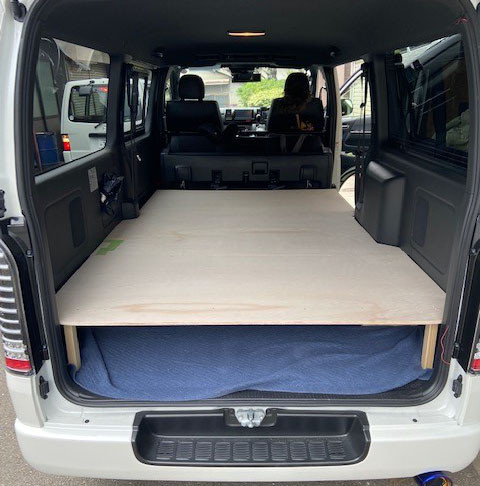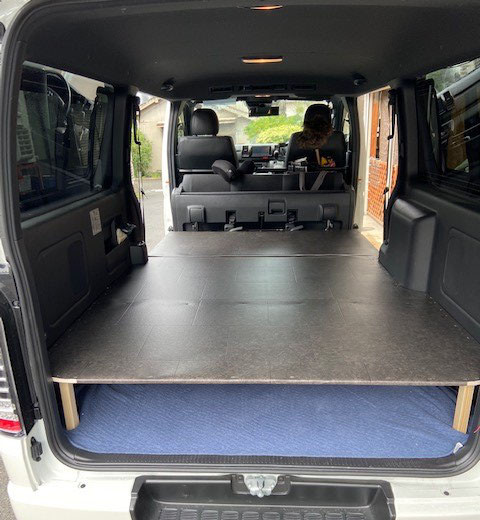 ハイエース荷台改良3 2020/07/07 ハイエース荷台改良3 ハイエース荷台改良3 こんばんは、tukuru woodwork fujimoです。 スツールが合板に擦れて傷つかないように上にクッションシートを貼ります。 内装色に合わせてブラック系のクッションシートにしました。 タッカーで留めて周りをカットするだけです。 背の高い物とかを乗せる場合に上げ床は返って邪魔になるので取り外し出来るようにしています。 3パーツに分解して外に出せるようになってます。 箱馬の付いている真ん中のパーツは出すのにちょっと苦労しますが・・・ 近直催事とミニイベントが有るので使い勝手を報告します。 ちゃんと積めれば良いのですが。 お問い合わせ