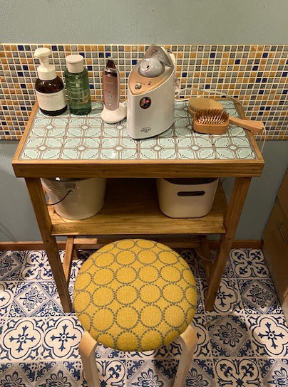 タイル張りドレッサージャスミンモザイクタイル 2020/07/26 タイル張りドレッサージャスミンモザイクタイル タイル張りドレッサージャスミンモザイクタイル こんばんは、tukuru woodwork fujimotoです。 奥さんからオーダーのタイル張りドレッサー完成しました。 棚を上げて下にスツールが入るようにしています。 高さ75㎝ 幅58㎝ 奥行31㎝ 高さが75㎝と少し高いのは棚に入れるボックスのサイズとスツールの高さを考慮するとこの高さに成ってしまいました。 洗面所に置くとこんな感じです。 床に柄のクッションシートを敷いたのでジャスミンタイルとちょっとケンカしてます。 とにかくこれで朝の洗面所争奪が激化しそうです。 お問い合わせ