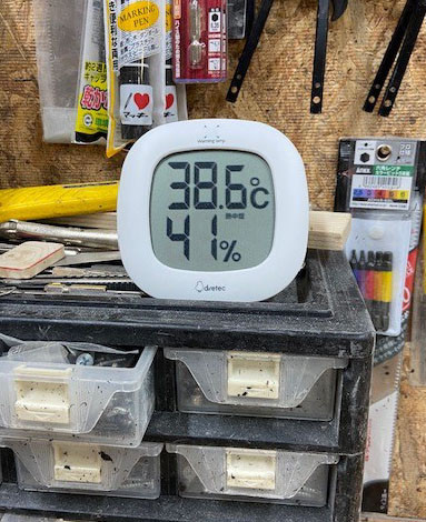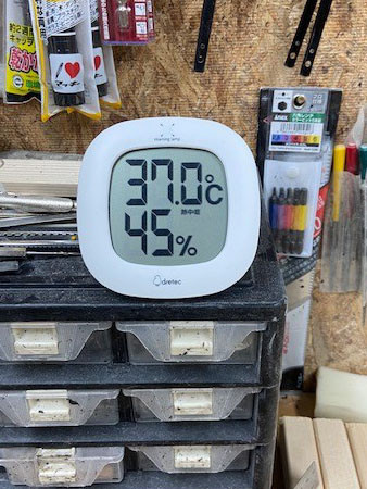最近スポットクーラーの冷風があまり冷たく感じないのでいったい工房は何度なのが気に成って家の温度計を持って行きました。
