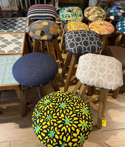 アンティーク調スツール60cmは小さなカウンター用で画像右側のチェーン柄でベージュとグレイでご指定頂いてます。